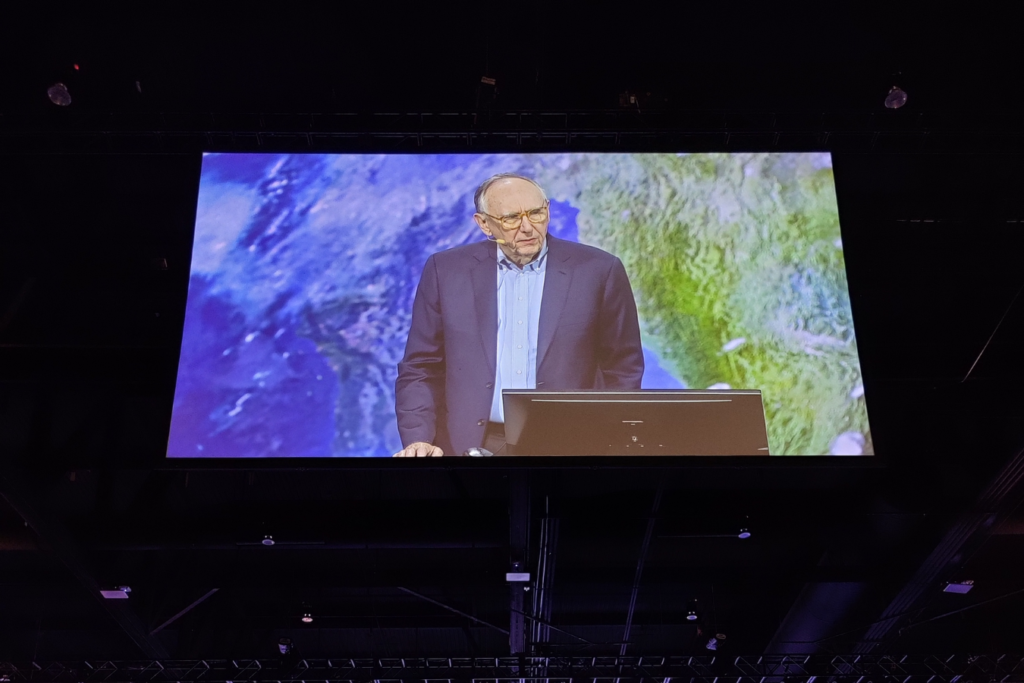 Jack Dangermond, Esri founder and president, discussing how geospatial technology is uniting our world during his keynote presentation.