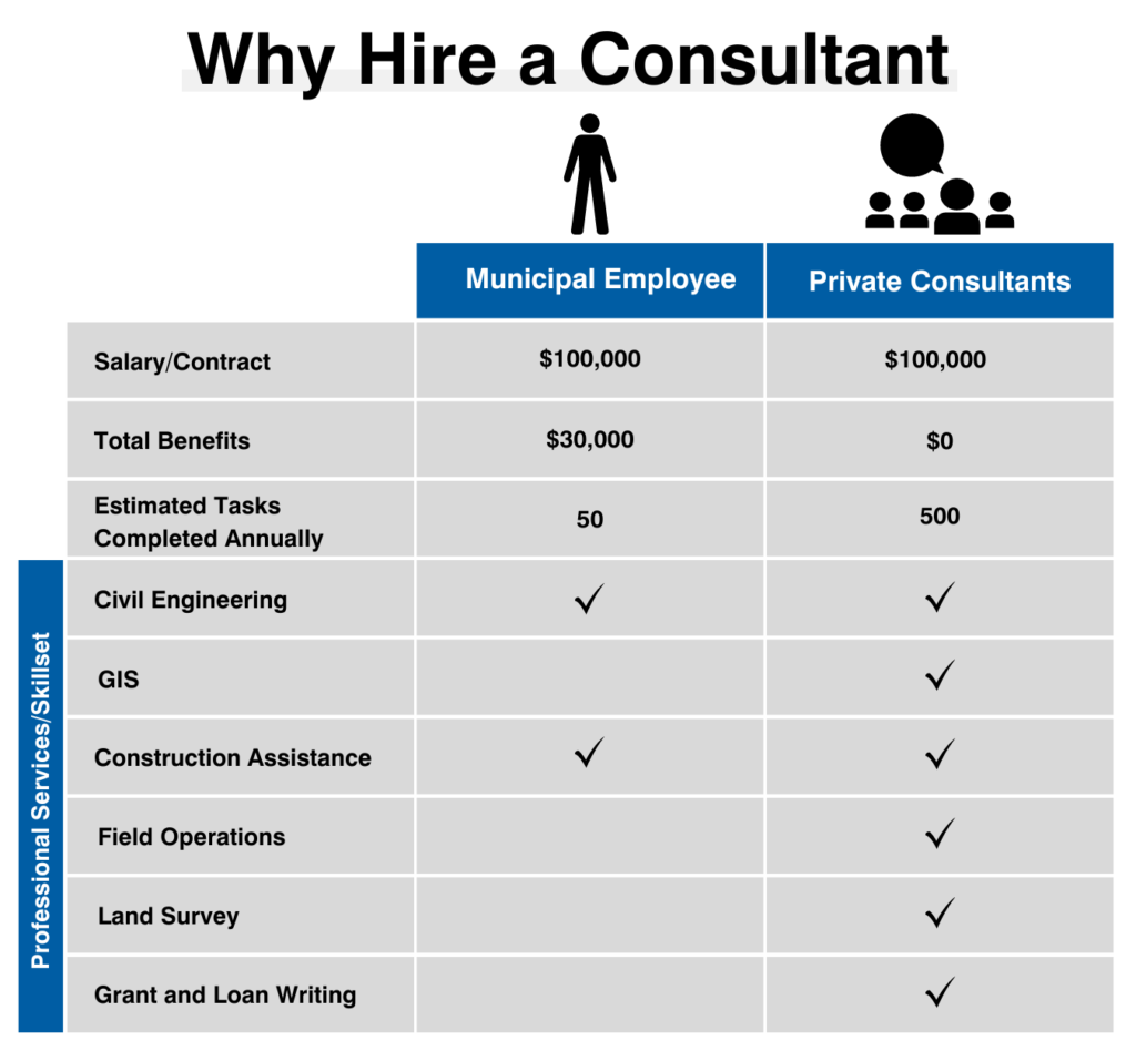 Moreover, the municipality receives access to diverse skill sets and tailored problem-solving. Whether it be grant and loan writing, infrastructure maintenance activities, or revitalizing roads, hiring a consulting firm allows the ability to connect with the exact subject matter expert required in each situation.