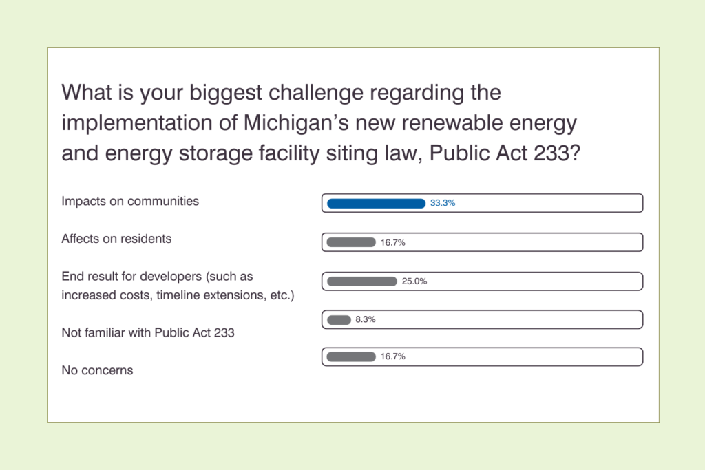 As outlined in the above blog, Public Act (PA) 233 introduces a secondary siting process for renewable energy development in Michigan. Our recent reader poll reveals how industry professionals are responding to PA 233’s implications.