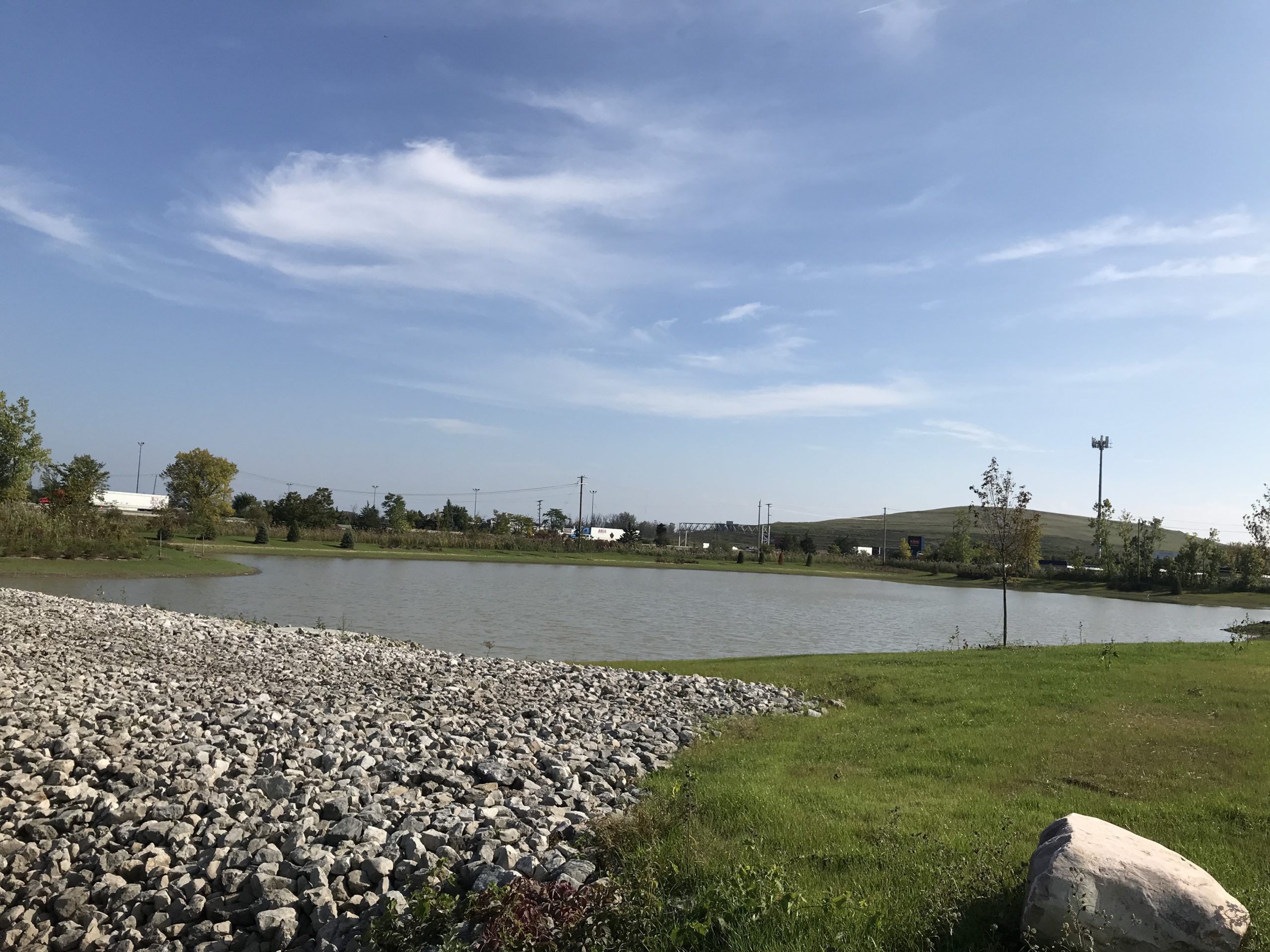 Site drainage is collected in an enclosed storm sewer system and discharges to one of two detention ponds, both sized to treat the first flush, bank full, and 100-year storm events.